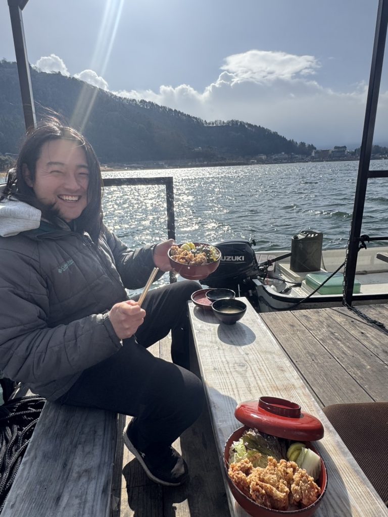 富士山を見ながら湖上での温かいご飯🍴